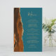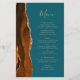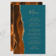 Den vänstra kanten på denna eleganta moderna bröllopsmeny har en bränd orange och rost vattenfärg agat kant med falskt guld glitter. Den anpassningsbara texten kombinerar guldfärgad handskriven script och kopparplåt font på en tealblå bakgrund. Baksidan har en matchande bränd orange och guld agat design.