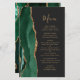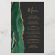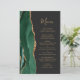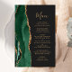 Den vänstra kanten på denna eleganta moderna bröllopsmeny har en smaragdgrön akvarell-agat-kant med falskt guldglitter. Den anpassningsbara texten kombinerar en fantasifullt guldliknande handskriven skrift och kopparplåtstypsnitt på en skiffer svart bakgrund. Baksidan har en matchande smaragdgrön och guld agat-design.