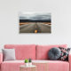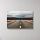 Konsten har en övergiven svart motorväg med en ljusare gult som passerar genom rand och som är målad nedåt och leder till mörkens berg i avstånd under ett vackert moody himmel. Originalkonst av Featherfall Studio.