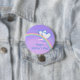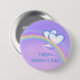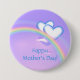 Knapp med min ursprungliga utformning av regnbåge och två vita och blå hjärtan i lila himlar. Texten säger "Lycklig Mors dag!"