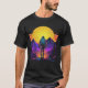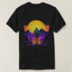 Ett stil färgat bergslandskap i coola med en hiker i solnedgången.