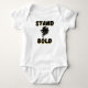 Den här karosseri för baby har en design som visningar ord "Stående fetstil" i ett fet utskrift med svart brev över en svart färgad med en svart och guld lejon huvudikon i mitten i detta trosbaserade bibelcitattema. Den här karosserisammanställningen passar som standard med enkel sliretikett plus enkel på och av tre fästanordningar och dubbla-nål-band som binds på alla öppningar.