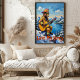 Denna hjärtslitande konst fångar en björn klädd i brandkårer, inklusive en hjälm och solglasögon, som spelar en akustisk gitarr medan den sitter bekvämt på en sten som är täckt av snö i bergen. En burk av honung med en dipper ligger nära. Bakgrunden är en lugn blå sjö som är belägen bland toppar med snö och eviga gröna skogar under ett delvis grumligt himmel. Målningens tjocka, texturerade linjer ökar bildens överhängande kvalitet, med orden "Kärlek My Honung" som visas nedan.