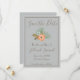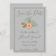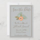 Ett högklassigt sparande av datumet illustreras med en vacker blå bakgrund. Om du använder ett blått och brunt färg-schema sparar du datumet med brunt ram och brunt text. "Spara datumet" står överst i ett vackert brunt kursivt teckensnitt. Underliggande är en persiko- och blå blommigt-grafik. Under finns mallar för infogning av bröllop-information. Anpassa dina Spara datumkort idag!
