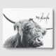 Ursprungsmonogram för det ursprungliga porträtt-namnet för den sydlandsbaserade kon i svartvitt. Porträtt fotografi av stora höglandet på en foggidag med vit bakgrund i svartvitt.
