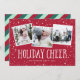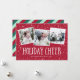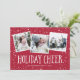 Festive helgdag-fotokort har tre fyrkantiga foton i en samlingslayout, med "helgdag cheer" i vita vita bokstäver på en ljus kranberröd bakgrund. Anpassa med namn och året längs grund.