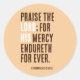 Höj Thanksgivingen Party - Klassisk rund fästare. Detta Bible Verse-klistermärke inspireras av Kung James Version 2 Chronicles 20:21-22, "Och när han hade samrått med folket utsåg han sångare till LORD, och det borde berömma heligheten, som de gick ut inför armén, och för all framtid berömma LORD för hans nåd. Och när de började sjungan och lovorda, satte LORD upp övergrepp mot barnen Ammon, Moab och Montera Seir, som var kom mot Judah, och de smittades." Lägg till ditt favoritcitat. Njut!