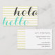 Tarjeta de presentación o negocios perfecta para servicios de idiomas. Si eres un intérprete, traductor, profesor de inglés, profesor de español, o si eres un profesional multilingüe o políglota con varios idiomas, ésta es tu tarjeta. Úsala para presentarte a tus clientes, alumnos, empresas y colegas del sector. "Hola, hello" pueden cambiar por otros saludos en otros idiomas. Tarjeta minimalista, sencilla, moderna con líneas horizontales amarillas y con un aspecto profesional. Personalízala.