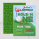 Superroliga Hole in One-födelsedagsinbjudningar med stor golfboll, golftees och gräs turf-teckensnitt. Perfekt för den lilla pojken eller flickan som fyller ett!
