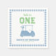 First birthday golf theme "Hole in One " with gold cart and light blue checkered plaid pattern.