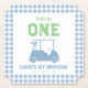 First birthday golf theme "Hole in One " with gold cart and light blue checkered plaid pattern.