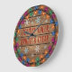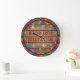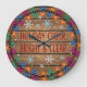 This festive clock features the saying "HOLIDAY CHEER, BRIGHT & CLEAR" in red text, centered on a rustic wooden plank background. A ring of colorful, twinkling string lights encircles the face, interspersed with delicate snowflakes and tiny stars. The overall design is warm, inviting, and perfectly captures the vibrant, joyful spirit of the Christmas holiday season with its cozy rustic texture.