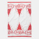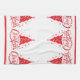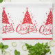 Holiday kitchen towel is shown with a festive Christmas tree and snowflakes print. Fanciful script text of Merry Christmas. Print is a border print with solid red border beneath.