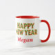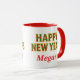Fun thoughtful holiday coffee mug with Merry Christmas on one side and Happy New Year on the other with area for a special message. Lettering in festive red and green geometric pattern outlined in gold.