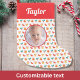 Ett sött julgrans-, klock- och julstrumpemönster med anpassat namn och fotodesign för familj och vänner som firar jul. Ersätt bilden med ett horisontellt foto.