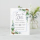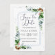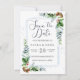 Inbjudan till elegant Winter Greenery Bröllop spara datum. Utformningen har en frostig effekt ram som är dekorerad med Holly löv och bär, gräs-koner och grönlöv.