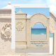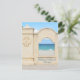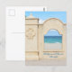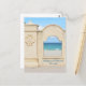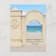 Havsutsikt från Hollywood Beach Florida Broadwalk på ett fotografiskt turism-kort. Genom ett fönster i muren längs med strandpromenaden kan man se den sandiga stranden och de olika nyanserna av blått vatten och himmel och bara en antydan till färgglada badgäster med sina stolar. Detta är originell kustfotografi av JLW_PHOTOGRAPHY.