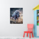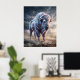 A massive hologram bison charges across endless futuristic storm plains, formed from transparent muscle geometry, glowing skeletal lines, and luminous vapor energy. Electric blue, silver, violet, and amber pulses race through its broad frame, emphasizing unstoppable strength. Lightning strikes, dark thunderclouds, wind-swept grass, cracked terrain, dust spirals, and distant towers create dramatic cinematic depth. This commanding bison design blends raw frontier power with advanced technology, ideal for offices, gaming spaces, studios, and collectors of bold wildlife imagery.