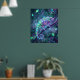 A fascinating hologram chameleon grips a futuristic vine, covered in shifting transparent scales, glowing circuit cells, and adaptive color-changing light. Cyan, lime, violet, magenta, and electric blue gradients move across its body while rotating eyes and curled tail add personality. Surrounded by luminous jungle leaves, mist, reflective droplets, and digital foliage, the scene feels vibrant and immersive. This playful cyber reptile design is perfect for modern interiors, gaming rooms, and reptile lovers.