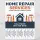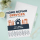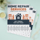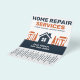 A professional home repair service flyer design with tear-off tabs in navy blue and orange colors with an illustration including hammer, screwdriver, paint roller, handsaw, wrench arranged around a house silhouette icon. Fully customizable, it can be perfect for all kinds of repair activities such as handyman, home repair services, plumbing, electrical, carpentry, painting, etc.