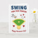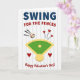 This greeting card mixes baseball and Valentine’s Day in a sweet, easy way ❤️💌. The background is white with light vertical pinstripes, like a baseball uniform. In the center there’s a baseball diamond with a green field and yellow infield shapes. A baseball with red stitching is shown flying past the diamond, with black motion lines that make it look like it was just hit. Red hearts are scattered around the field, with three hearts rising up from the outfield and one heart sitting near home plate. Near the top, the text says “SWING” in navy blue block letters, and below it “FOR THE FENCES” in red letters that slant a bit. At the bottom, “Happy Valentine’s Day!” appears in red, tying the whole design together like a fun note with a box of chocolates 🍫.