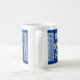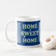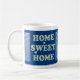 Ett Land-stil-kaffe Mugg med "Home Sweet Home" och hjärtan i Mix'n'Match of Primroses och Blue Check Gingham Mönster på en marin blå bakgrund.
