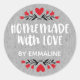 En personlig "homemad with kärlek"-dekal på en grått-papper texturerad bakgrund. Gör det till din egen genom att lägga till din egen namn. Roligt för Alla hjärtans dag, eller tillfälle. Gör en söt som avslutar vid alla dina handgjorda presenter. Designad av Blackberry Boulevard.