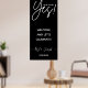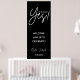 Enkel kalligrafisk skylt för förlovningsfest med 'Hon sa Ja!' -bokstäver. Olika bakgrundsfärgalternativ finns tillgängliga: Svart, Marinblå, Burgunder, Smaragd och Rost. Namn och datum för evenemanget är redigerbara.