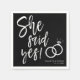 En rolig och unik helsvart servett med vitt manus som är specialdesignad för din kommande förlovningsmiddag eller fest. Den har orden "Hon Accepterade!" med vigselringar bredvid. Under detta och ovanför detta står namnen på bruden och brudgummen och datumet för förlovningen eller bröllopet.