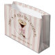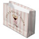 En sofistikerad och lekfull presentsäck för en dam-födelsedag med det populära espresso martini-temat. Martini är täckt med ett frostigt lagrar av skum och kaffebönor och är bunden med en rosa-chiffon på en feminin rosa och en baksida av elfenbensbeige. Dessa detaljer bidrar till synen på eftergivenhet och firande och har också en viss återblick och känsla! Anpassa den här mycket speciella födelsedagstecknet med hedersgästen namn.