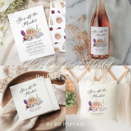 Vi presenterar vår charmiga bröllopsfest-kollektion "Hon är inte längre på marknaden"! Denna förtjusande kollektion har ett lekfullt bondemarknadstema, perfekt för att fira den blivande bruden. Med sina fantasifulla illustrationer av frukt, vin och mat samt en mysig picknick-design sätter kollektionen tonen för ett roligt och stilfullt firande. Kollektionen fångar glädjen och fräschheten i nya början, vilket gör den till ett idealiskt val för en oförglömlig bröllopsfest.