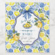 En elegant bröllopsduschdesign med blå kakelbakgrund och citroner.