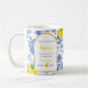 The "She Found Her Main Squeeze" bridal shower kaffekopp har blå blommor, gula citroner och svart-gul text.