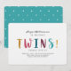 Tvillingar baby shower inbjudan design med vår enkla och minimala typografiska layoutdesign. "Tvillingar" är utformad i en rolig färgrik teckensnitt. Baksidan är en djärv teal bakgrund, med roliga vita klotter prickar. Alla illustrationer och layout är designade av Moodthology.