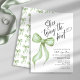 Hon Gifter sig Sage Grönt Bow Inbjudningskort för möhippan. Enkel elegans. FRONT: Har ett sött vattenfärgsbord för grönten stil och ett handskrivet kalligrafiskript. Du kan ändra färg i texten, inklusive frasen överst. BAK: En överarmsbåge mönster. ©Kimbelled, LLC