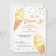 Hon har blivit uppstoppad med glass och sprinkles inbjudningskort för möhippan-mall omedelbart nedladdad, gult banan flavor glass.