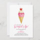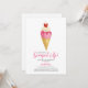 Inbjudningskort för möhippan med en våffelkon, en skop av rosa glass, sprinkler, vispgrädde och hjärtkörsbär. Perfekt för en möhippa av glass party. Se samordna saker i vår butik, Enchanted Finch.