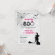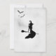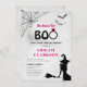 Hon hittade sin Boo Halloween Inbjudningskort för möhippan med häxfluga på broomstick, cobweb och fladdermus. Roligt Halloween Tema möhippa inbjudan.