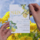 Elegant och sötvattensfärg Hon hittade sina huvudsakliga inbjudningar till Möhippa med Lemon. Med vackra elegant dammiga skifferblåblommor och sötcitroner av gult. Tillgänglig utskriven med kuvert eller för högupplöst digital nedladdning. Blå baksida med mer bedövande vattenfärgscitroner och blommigtar.