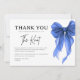 Uttryck din tacksamhet med en tidlös stil med detta She's Tying The Knot - Blåa band bröllopsdusch tackkort. Designat med ett snyggt blått bandmotiv och ren, modern typografi är detta kort den perfekta avslutande detaljen för att tacka gästerna efter en bröllopsdusch, förlovningsfest eller bröllopshelg.