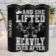 Den här kraftfulla bilden har silhuetten hos en kvinna som sitter med en barbell, krökt med en liten tiara. Utformningen omfattar den kraftfulla och kraftfulla slogan "OCH HON LIFTED HEAVILY EVER EFTER", som skapar en motivationsfull påstående biet för kvinnliga livare i en nödlidande vintage stil.