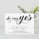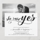 Modern, trendig, enkel inbjudan till förlovningsfest innehåller "ja"-kalligrafiskript i handskrivet brev, par namn och party. Lägg till favoritfoto för paret på baksidan.