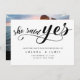 Modern minimalistisk svart sa hon ja skript spara datumkortet. Den här eleganten innehåller handskript i svart färg med sött rött hjärta ovanför texten "hon sa ja" på vit bakgrund och bröllop och namn skrivet med versaler i svart färg.Lägg till webbplats och foto på baksidan av kortet. Om du vill redigera mallen klickar du på anpassa ytterligare.