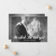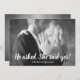 Enkel och elegant fotografering för förlovningsmeddelande är perfekt för att sprida nyheten till familj och vänner om din nya förlovning. Lägg till ett foto av det nyligen förlovade paret. Längs den nedre delen av fotot är text i vit script-teckensnitt som säger Han frågade. Hon sa ja!. Det finns också anpassningsbar text i standard vit typsnitt för att lägga till det förlovade parets namn. Baksidan av kortet är i solid silverfärg och har stor text i mitten i samma vita script-teckensnitt som säger Håll utkik.... Dessa förlovningsmeddelanden är en underbar föregångare till dina förlovningsfest-inbjudningar, save the date-kort eller bröllopsinbjudningar. De är enkla och eleganta, så de kommer att matcha eller motsvara alla framtida