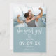 En roligt med ditt foto till inbjudan med dina gäster till sparan av din bröllop-dejt med ett informellt trendig-skript för henne sa Ja! Ord "och" mellan namn och Vänligen Spara Vårt datum mot grund finns båda i samma uppsatta skript. Resten av texten kan lätt bli personlig. Ladda enkelt upp ditt favoritfoto av dig båda för att byta ut exemplet i mallhållaren. Texten är vit, med en dammig blå bakgrund på båda sidor. Du kan ändra färger och bakgrund för att förbättra kostym på fotot eller bröllop färg om du vill genom att anpassa ytterligare alternativ.