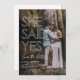 Modern sparar meddelandet om datum för förlovning med ett foto av dig och din partner, talesättet "hon sa ja" i ett fet typografiskt ihåligt teckensnitt, namn, datum och plats för ditt framtida bröllop.
