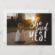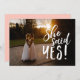 "Hon sa JA!" i handskrivet stil-teckensnitt över ditt utfallsfoto från fullt. Anpassa färg i bilden och baksidan så att bröllop-informationen stämmer överens. underbar för att spara datumet eller ett meddelande om förlovning eller party.