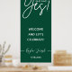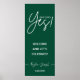 Enkel kalligrafisk Engagemang Party skylt med 'Hon sa Ja!' text. Olika bakgrundsfärgalternativ tillgängliga. Namn och datum för evenemanget är redigerbara.