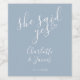 Denna stilrena dammiga blå "hon sa ja"-etikett för bröllopsfest kan anpassas med dina detaljer. Designad av Thisisnotme©