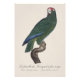 Illustrationen visar den eleganta kvinnliga kubaparakiten, vetenskapligt känd som Amazona leucocephala, utförd i en klassisk naturalhistorisk stil. Denna art är infödd på Karibien, särskilt Kuba och närliggande öar, där den lever i skogar, mangroveskogar och skogbevuxna savanner. Fågeln kännetecknas av sin livfulla gröna fjäderdräkt, med subtila blå nyanser på vingarna och en tydlig röd markering på ansiktet, vilket förklarar den historiska franska referensen ”Perroquet à face rouge”. I denna bild sitter papegojan graciöst på en strukturerad gren och visar sin böjda näbb och alerta kroppshållning – egenskaper som är typiska för intelligenta och sociala papegojor.